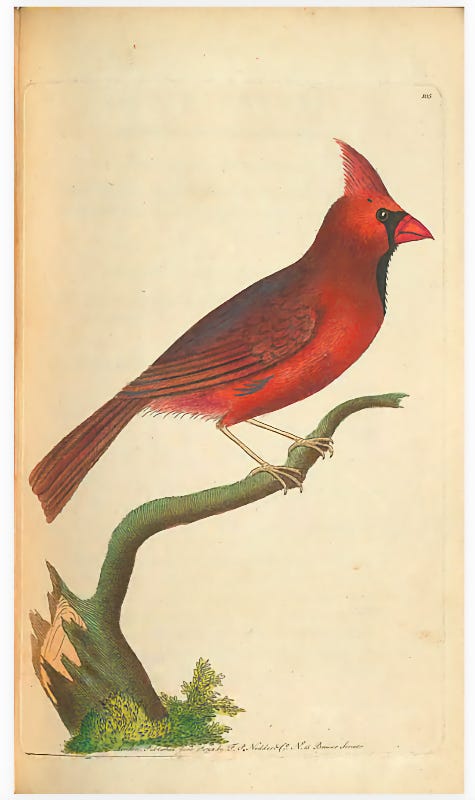 A few years earlier, the bird had already been noted by naturalists and illustrators, most notably Mark Catesby. In his multi‑volume work The Natural History of Carolina, Florida and the Bahama Islands (published between 1729 and 1732), Catesby included a detailed illustration and description of the cardinal, which is often cited as the earliest known European observation of the species in a scientific context. However, Linnaeus’s 1758 entry is regarded as the first official scientific record.