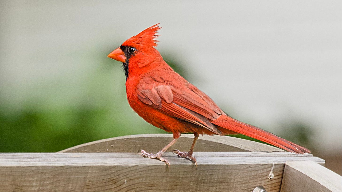 Before getting down to the biology of Cardinals I was curious to get a feel for how such a well-known bird had inspired writers. Surprisingly, not a lot seems to be the answer, despite the birds general ubiquity. Thoreau, in his Walden, mentioned “The redbird, which is the only bird that sings in winter, whistles cheerily from the top of a tree” and then moved on to other topics - Redbird being a one-time common name for Cardinals. Mary Oliver (who?) deathlessly wrote “The red bird came all winter, firing up the landscape as nothing else could do.” And one Annie Dillard, more recently, wrote “A cardinal flashed through the trees like a burning leaf.” You get the gist of it. The great literary world of North America pretty well ignored these splendid birds other than for background colour. In some desperation, dear reader, I consulted “Lumo the Proton Purple Cat” (a Swiss privacy-focussed AI tool) and managed to scrape up “With a rare leaf for a roof in the rain, With a rare cap for his cardinal hood, The cardinal bird remains.” garnered from “The Cardinal Bird” by Orrick Johns (Poetry Magazine, Jan 1931).
