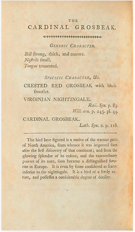 Subsequently, aided in my searches with Lumo (vide supra), I was led to an Australian website of the Biodiversity Heritage Library which contained some pages from Shaw, George Shaw’s (1792) “The Cardinal Grosbeak, Loxia cardinalis in “ The Naturalist’s Miscellany”. Cardinal Grosbeak being the name of the species 234 years ago. Seemingly this may be the earliest extant print reference to the bird: