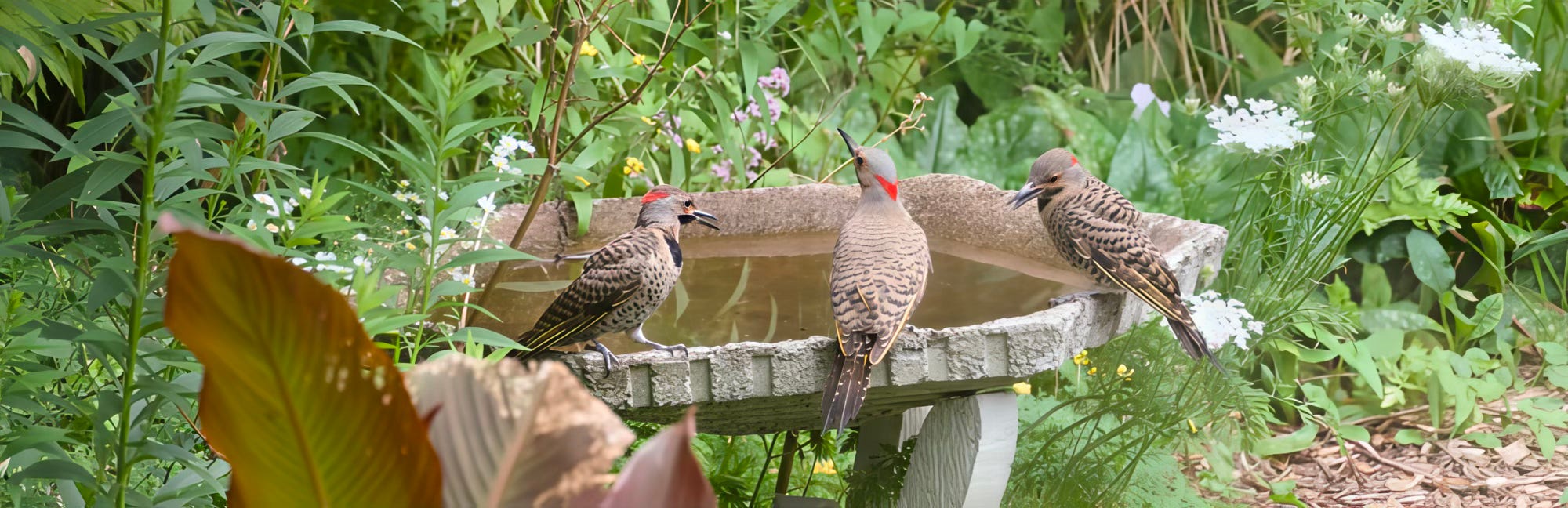 Yesterday, we observed a nice 21 species of birds in the garden during our daily observing hour from 7-8am, accompanied by good tea. Then, rather less regularly, we did a second hour over luncheon around 1pm and totted a gratifying 23 species that time. Warblers are starting to appear again in recent days … as migratory species, having done the raising of the next generation thing, are beginning to consider drifting southwards, though for most species it will be a few weeks before they actually depart. These included Yellow Warbler, Yellow-rumped, Redstart, Magnolia and Bay-breasted. Later a gang of three Northern Flickers, we are assuming litter mates (?), met for a chat around our bird bath: