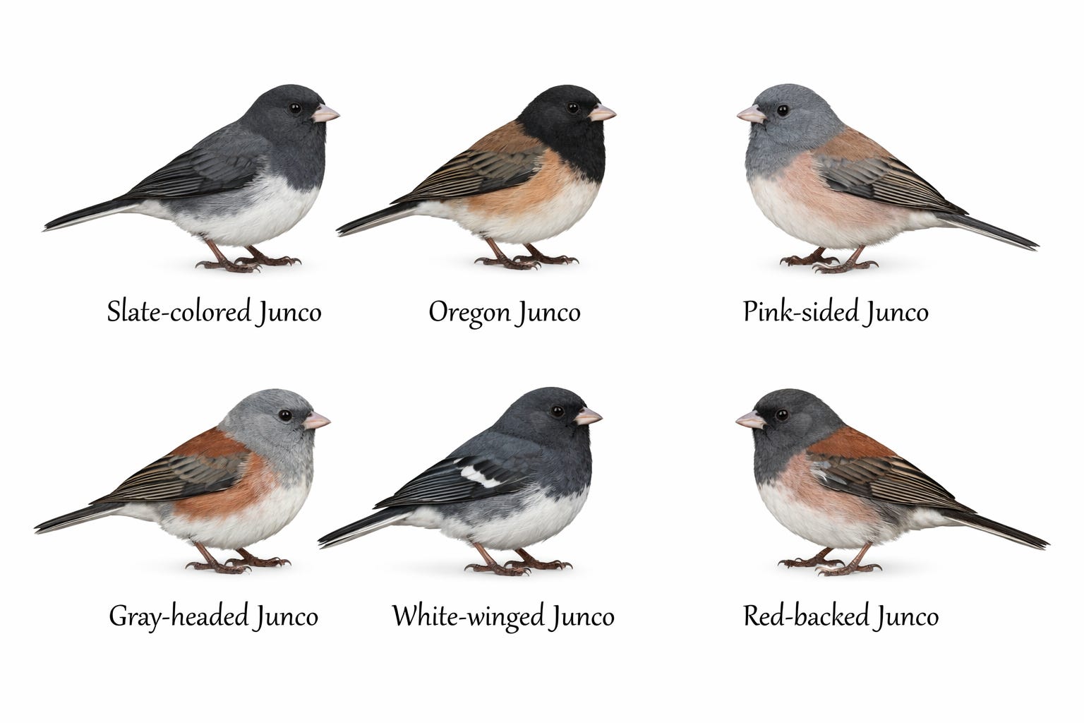 Back in my working days I attended a scientific meeting in Salt Lake City which had the obligatory day off for sightseeing. Some of us took a rental car high into the mountains where we found a strange little bird none of we easterners recognized but which turned out to be a western subspecies of our “Slatey-backed” Dark-eyed Juncos. Very, very different. There are some dozen recognized subspecies including slate‑colored, Oregon, pink‑sided, gray‑headed, white‑winged, and red‑backed). The marked colour and behavior differences are thought to reflect post-glacial expansion into new habitats after the last Ice Age.