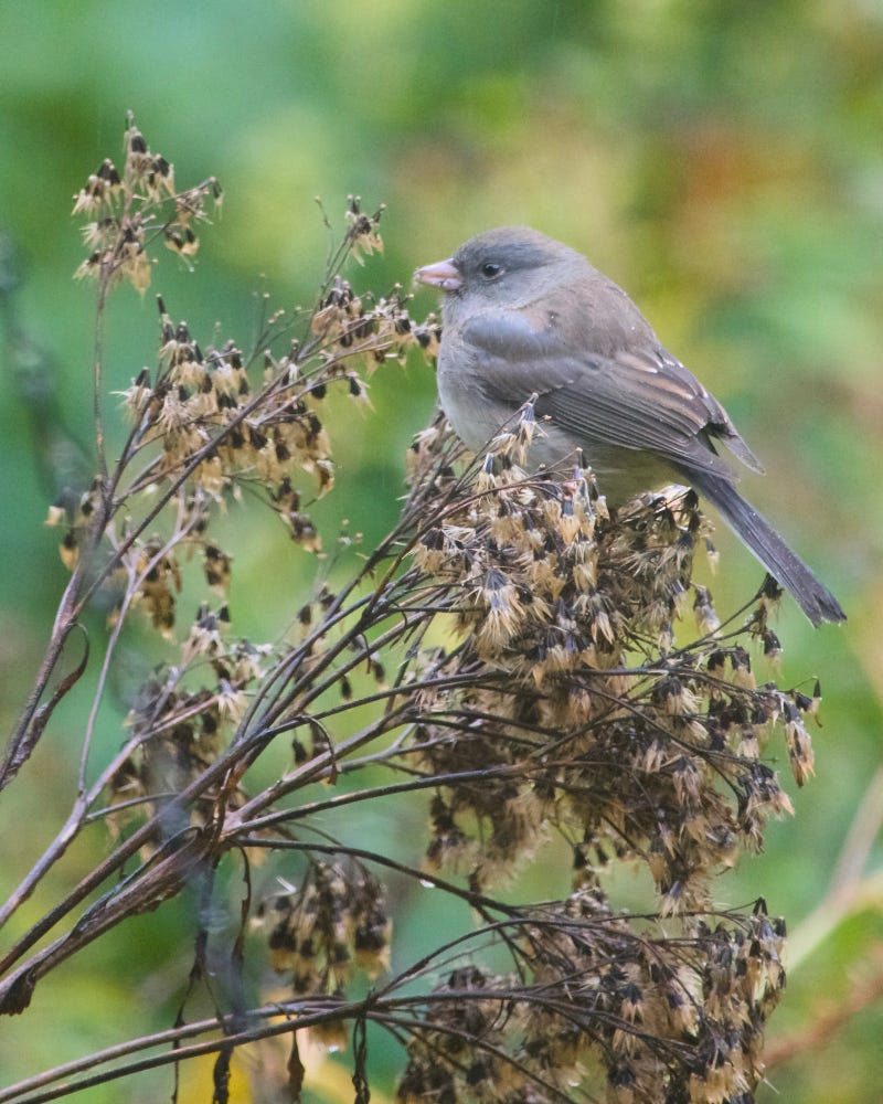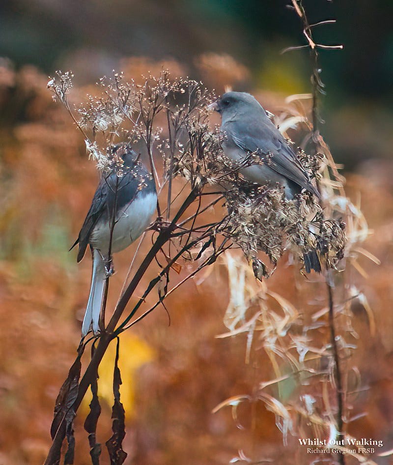 The genus Junco, is in the New World sparrow family Passerellidae. They were first described by Carl Linnaeus in 1758 as Fringilla hyemalis. Subsequently they were moved to the genus Juncus. Latin for rush, apparently - what’s the connection there, I wondered? As far as I can tell, the naturalists who first described these birds noted that they were frequently found in or around rushy habitats. The genus name Junco ultimately traces back to the Latin juncus (“rush”) via Spanish junco, and was chosen because of the rush‑filled places they were seen … which is good were it not that whatever they were doing in the past, most Junco species actually prefer dry, open woodland or shrubby habitat rather than dense rush beds. Next question, why Spanish? These are near Arctic birds and not many native Spanish speakers up there. Was the name selected by a Spaniard? At this point, I climbed out of the rabbit hole before I got stuck.