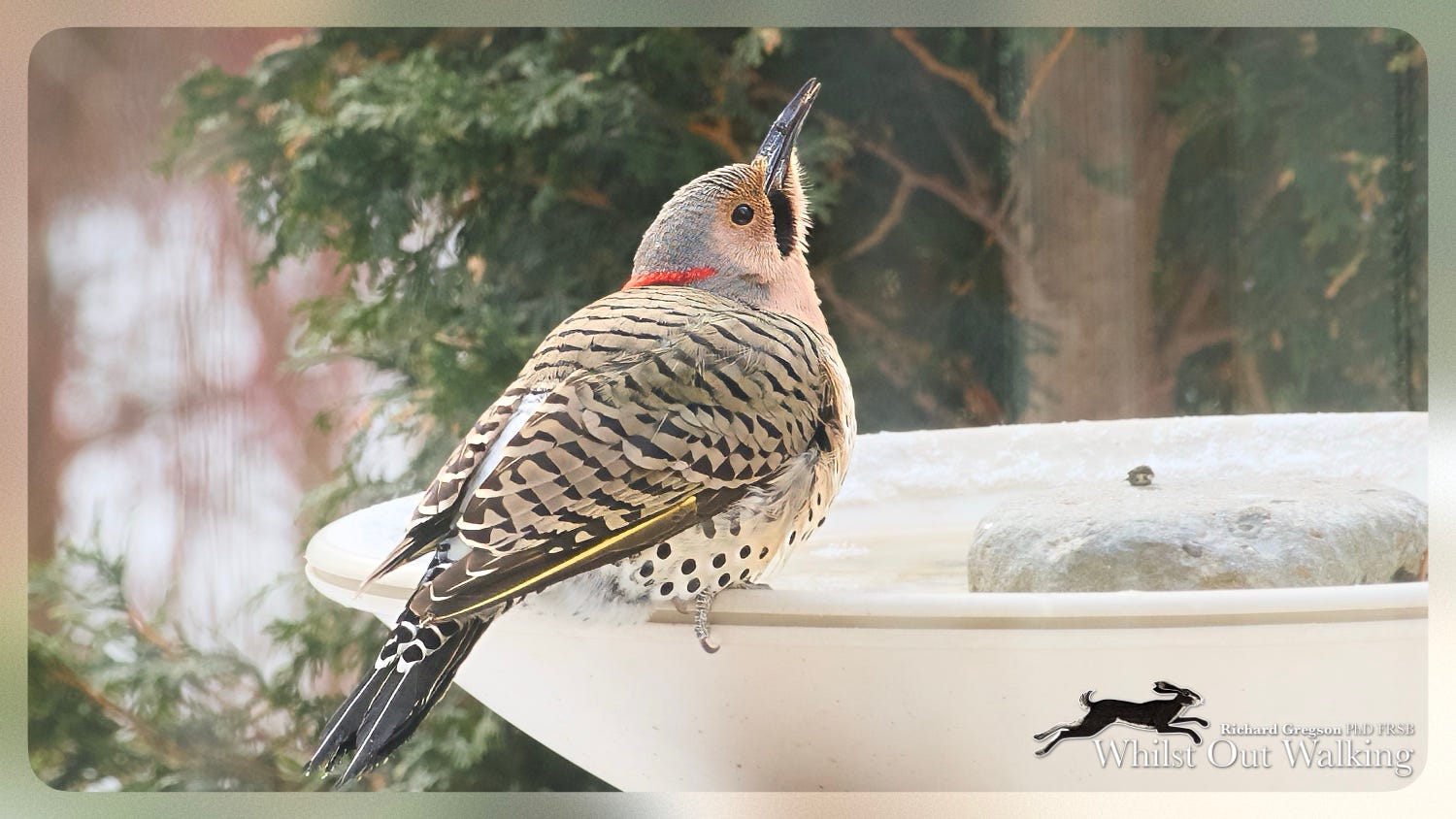… several weeks before it should be here, was a Northern Flicker - a migrating Woodpecker species - pausing in the garden for a drink. What was it doing here before the end of February? Although occasional birds are seen in a Montreal winter - we actually had one in the garden on New Years Day - they are most unusual. According to eBird, we have a recorded frequency of just 2.8% in February with populations not starting to significantly increase until April, reaching a peak in early May at 52%. Smart bird, anyway and very welcome. It was back again for a drink the next day.
