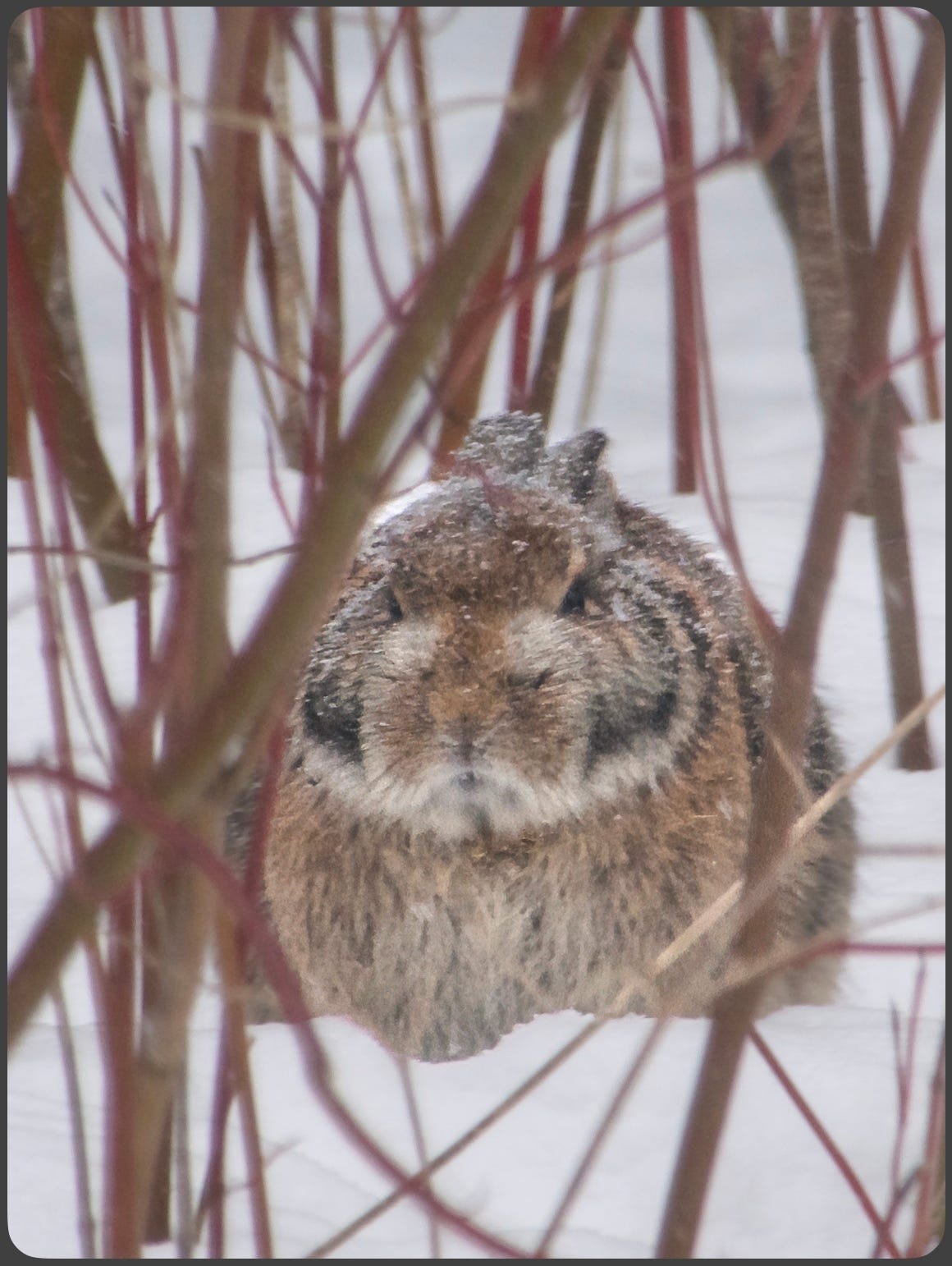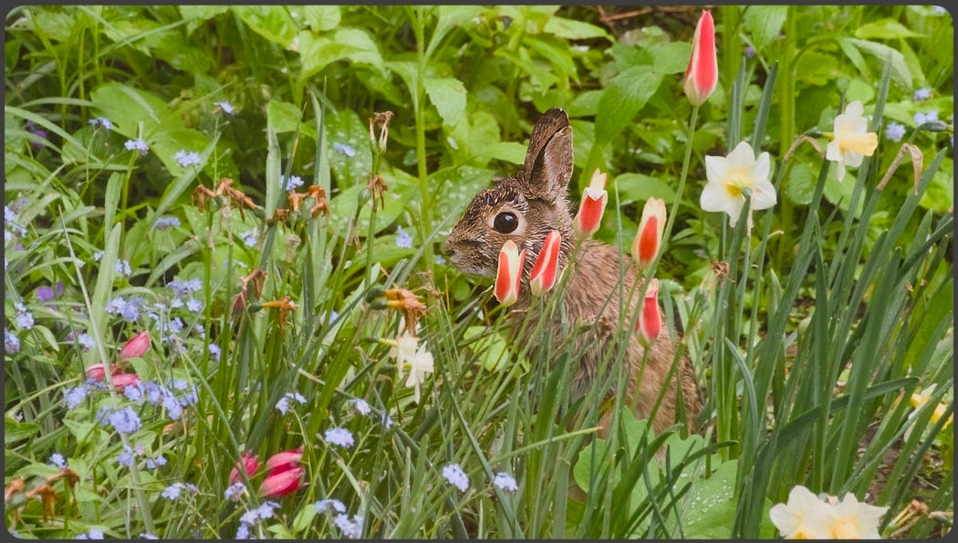 I serendipitously decided on “Rabbits” for this second Sunday Wild Encounters post because we have a resident that has set up home in the garden and wanders around seeking seed husks that have fallen from a bird feeder and nibbling on dried stems of plants left to overwinter half below the snow. Last winter he killed a couple of young shrubs by ring-barking the stems - hope that isn’t going to be repeated.