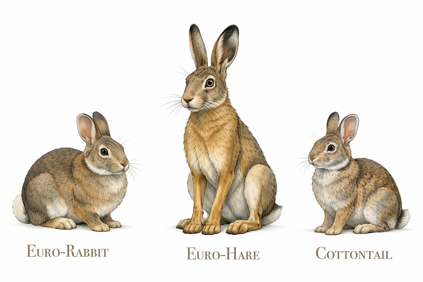 In today’s world European Rabbits have evolved as specialized burrowing animals and European Hares evolved separately as open-country speed runners while in North America Cottontails adapted to their environment and became generalists, sitting in behaviour midway between Euro-Rabbits and Euro-Hares. They are more compact than hares and considerably less specialized for digging than Euro-Rabbits; in fact they don’t dig at all, just do some rearranging of cover grasses under a sheltering shrub. Hares favor open habitats and rely on speed to evade predators and Cottontails usually live in dense cover where they can rely on hiding for safety. Euro-Rabbits, of course, just need to be able to run fast enough to get to their burrows where they are safe. Cottontails are adapted for environments with plenty of cover and rely on high breeding rates, whereas hares exploit open habitats and invest more in each newborn’s immediate survival - hares are born with hair and open eyes and almost ready to run.