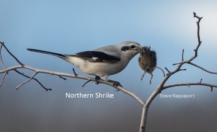 Northern Shrikes (Lanius borealis) are usually seen once or twice in winter where we go walking, but they are not common. Despite being songbirds they are active predators. They have a smart slate‑gray back, white underparts, and a strongly marked black mask stretching from the eye to the neck. Really, in many ways they more resemble a small hawk than a typical songbird with a hawk-like sharp, hooked bill for seizing insects, small mammals, and even other birds. Prey is often impaled on thorns or barbed wire for later consumption or just for ease of handling - hence the common name of “butcher bird.” Shrikes don’t have talons like hawks do and so impaling prey on branches enables them to use these sharp objects to tear their prey apart. Is this yet another example of a bird using tools?