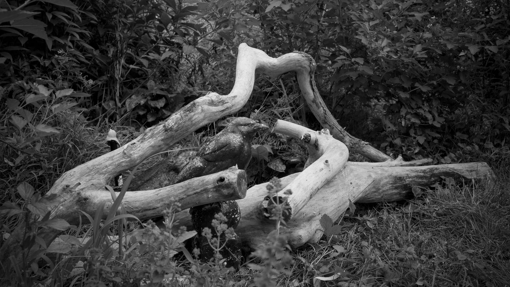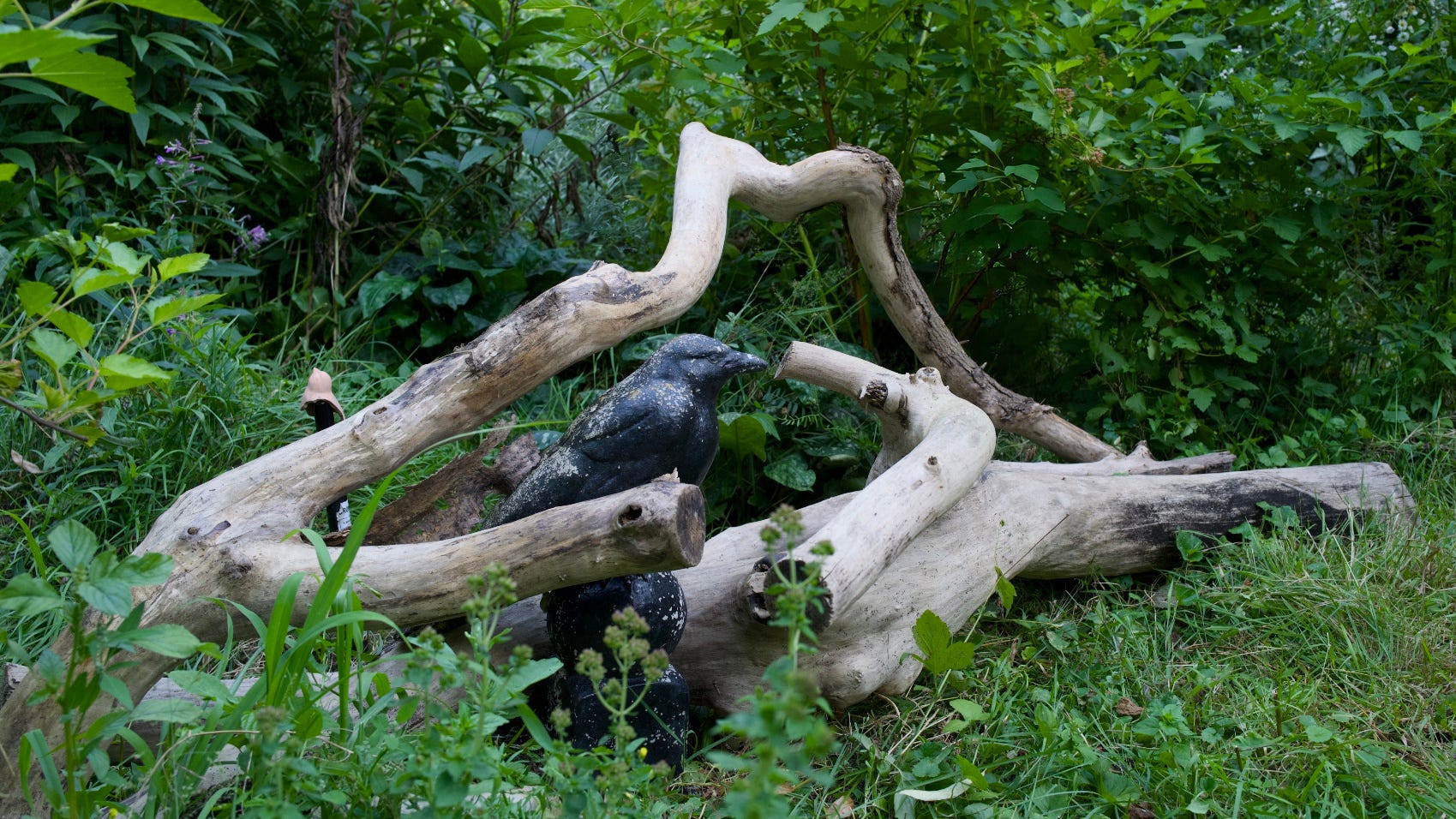 The town had been dealing with a dead tree beside a path between our road the next one. We rescued some interesting pieces and the seemed to self assemble into this structure. The Corvid is K’Nuf and he has watched the garden for years.
