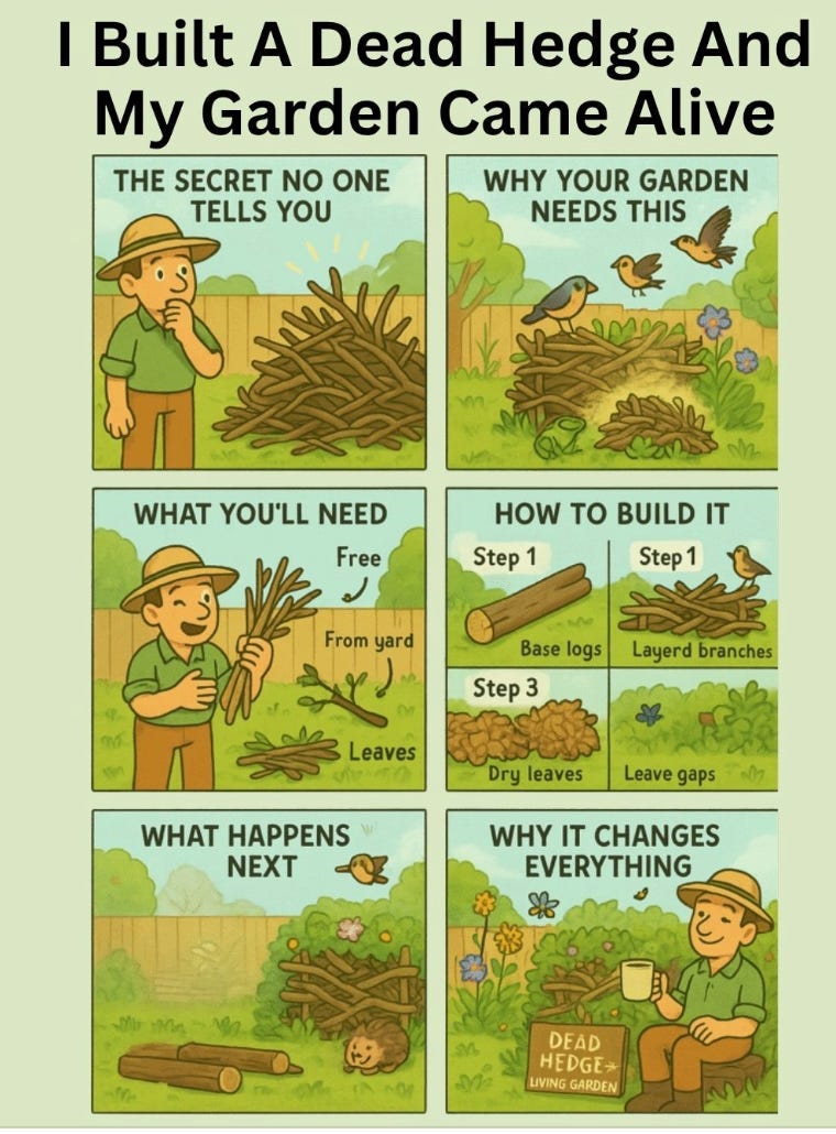 Love the dead hedge! Neighbour children were coming onto our property (and picking my daffodils etc) so I started blocking the gap in the fence with gathered brush, of which we always have a lot! The brushpile has become a refuge for a lot of wildlife and now wildings are growing around it. Bonus 😁