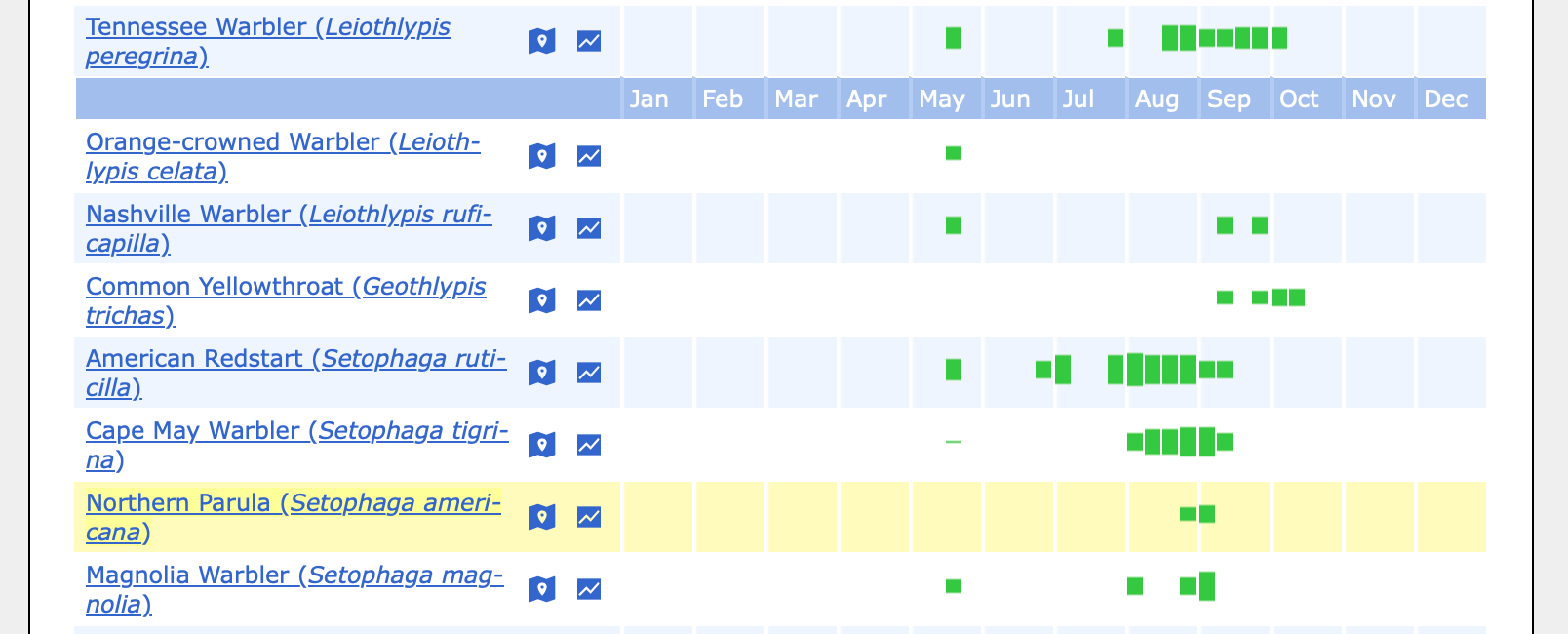 I, courtesy of eBird, have a chart showing which birds were seen and when. You can view a copy from the following link.