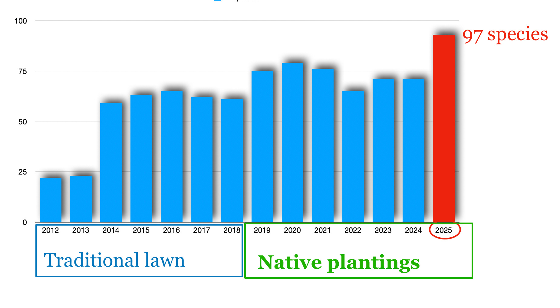 This following graph shows how the species totals in each year have changed to the extent that in 2025 we recorded a total of 97 species from January 1 to December 31. I was really hoping that we’d make 100 but it was not to be.