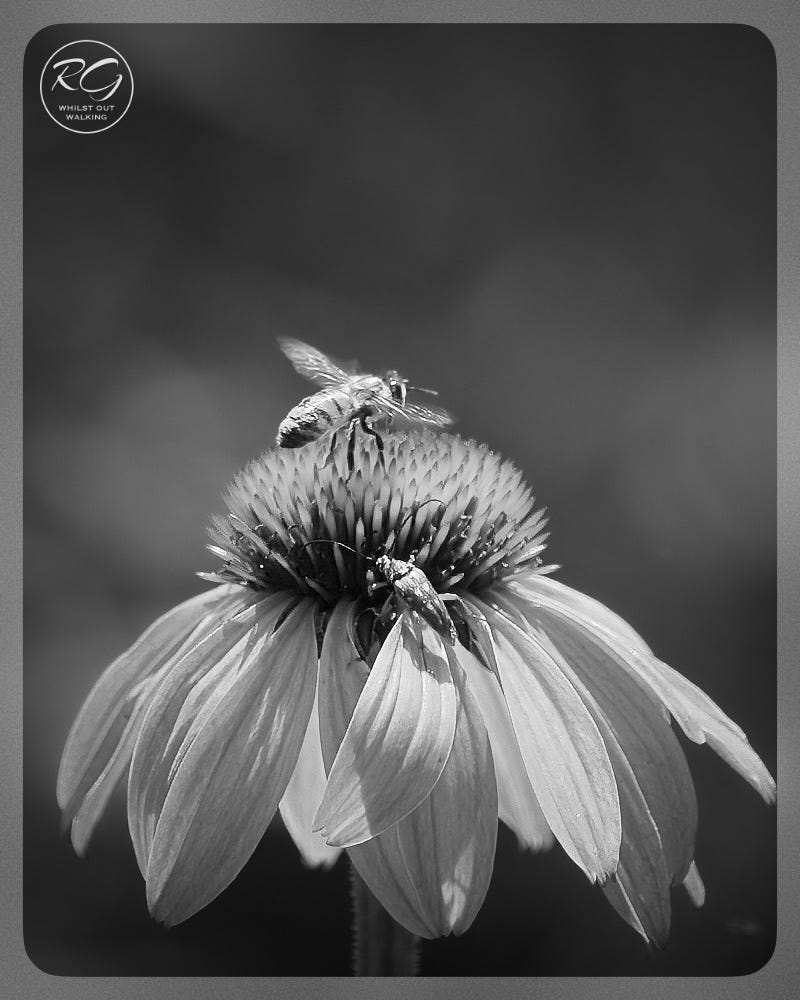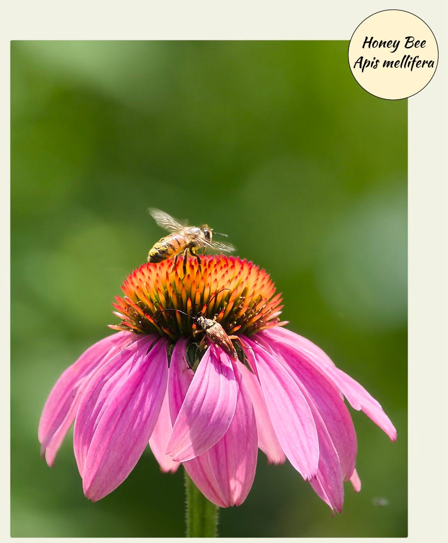 Honey Bee and Flower19 JulyWhilst Out WalkingJul 19, 20251722ShareA Honey/Hive Bee (Apis mellifera) pays attention to a Coneflower. Not hard to see interactions like this Whilst Out Walking.There is also a small Banded Longhorn Beetle (Typocerus velutinus) present - see it?Seen differently … PreviousNext