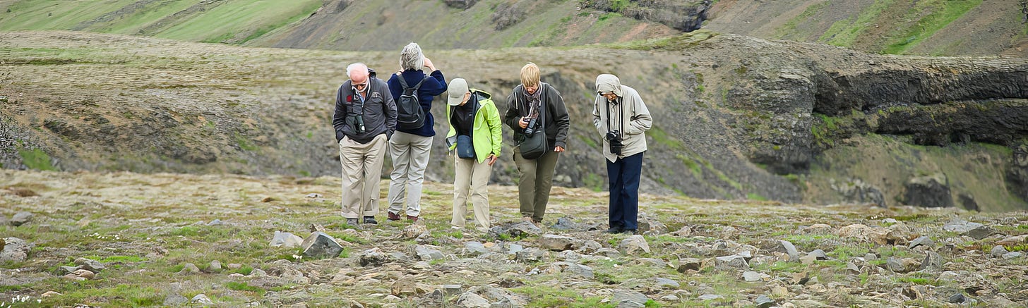 This needs rectifying. More “nature walks” from schools and organised field trips by birding clubs etc for adults might be a start. They exist, but they are not often enough known about or even accessible. For example, here is a small group of questing botanists on a hillside.