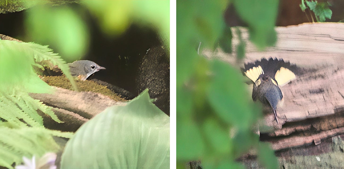 American Redstarts are not a particularly rare species but if we see one in the garden in a summer season we reckon we have done well. This year, however, they have been fairly regular, albeit always fleeting, visitors that are never around long enough to grab a camera … until yesterday morning when a female went for a splash in the waterfall. It did it’s best to hide behind foliage but I got a couple of satisfactory record shots which, after having been heavily denoised and super-sharpened in Topaz, I present for your delight.