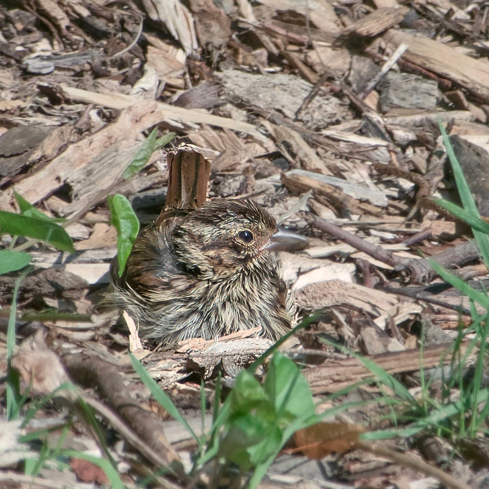 *Now, the question is, which species? One at least is very young and their feathers are in a mess. I confess to having been conflicted initially about identification … either Chipping Sparrow or Songsparrow. I can see differences, I think with CHSP below and SOSP above - but on the other hand it seemed to be pretty unlikely so close to each other, no more than two feet apart. Marcel, my pro-guru in these matters has had a look and agrees that I have a scruffy adult Chipping Sparrow, probably molting while or just after raising its young in the lower image and the one above is a Songsparrow youngster. He further suggests that, although they are close together, which is unusual, there is probably overlapping breeding territory.
