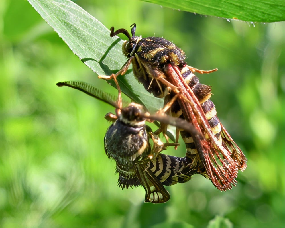 Despite first appearances with the yellow and black striped abdomen, these two insects busily occupied in creating the next generation of their species, are not wasps of any variety, although they mimic them, presumably for protective reasons. In fact these are moths - note the feathered antennae.