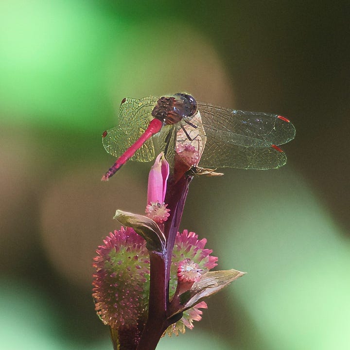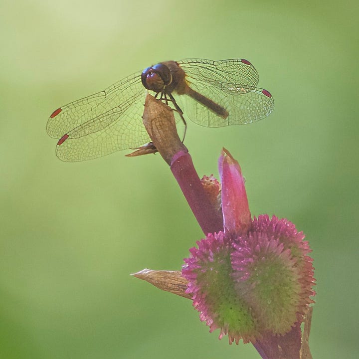 Starting to see Dragonflies (Odonata or “Odes”) around this week. This specimen, an Autumn Meadowhawk (Sympetrum vicinum) settled in warm sunshine on the seed pod of a canna lily and cooperatively posed while I tried to get a photo against the direct sunlight.