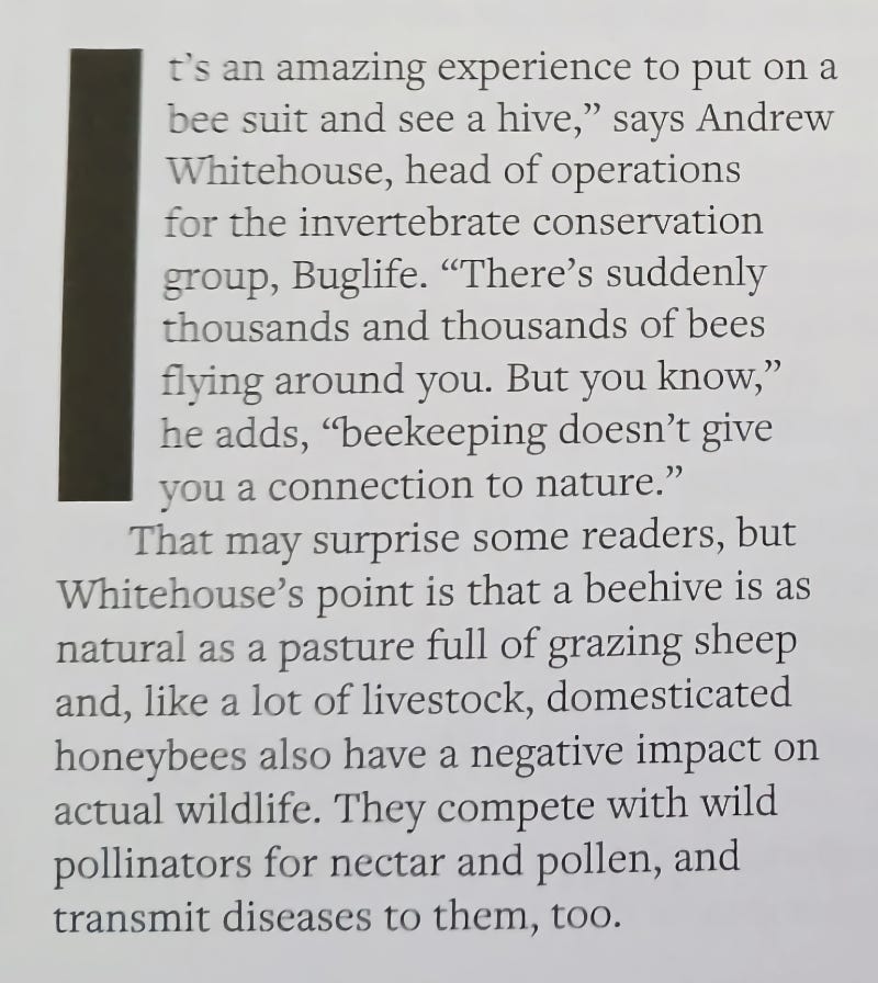 Right on! As I quoted in one of my Substack posts (https://open.substack.com/pub/backyardstewardship/p/apex-pollinators?r=1firyf&utm_campaign=post&utm_medium=web&showWelcomeOnShare=false), the executive director of the Xerces Society said, “Keeping honey bees to ‘save the bees’ is like raising chickens to save birds.”
