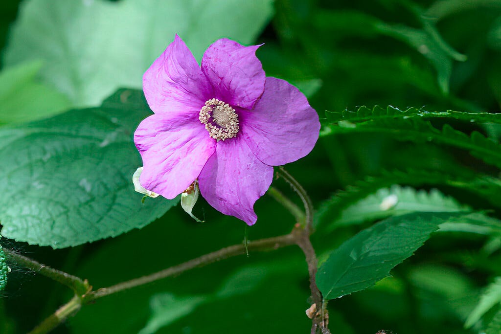There there is the very frequently observed Purple-flowered Raspberry (Rubus odoratus) which is quite shade tolerant and happily spreads by runners once it is established. Related wild raspberries you might encounter are the Dwarf Raspberry (Rubus pubescens), and the innovatively named Red Raspberry (Rubus idaeus). The raspberries are all exploited by songbirds, butterflies, bees, and both large and small mammals as well as providing nesting material for some species of bees. The fruits are edible but not very exciting.