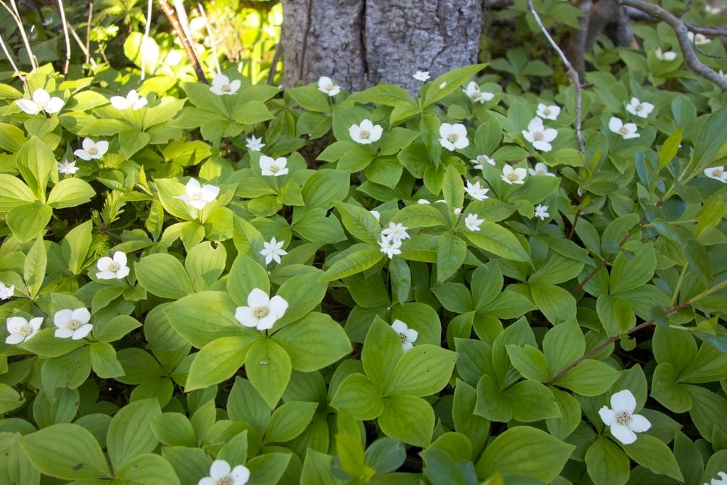 There are the several highly desirable species of Dogwoods (Cornus spp.) like the Red Osier Dogwood (Cornus sericea), the red bark of which brings some colour to the countryside in winter. If you are from the Maritimes you will recognize Bunchberry (Cornus canadensis) though it is less common here.