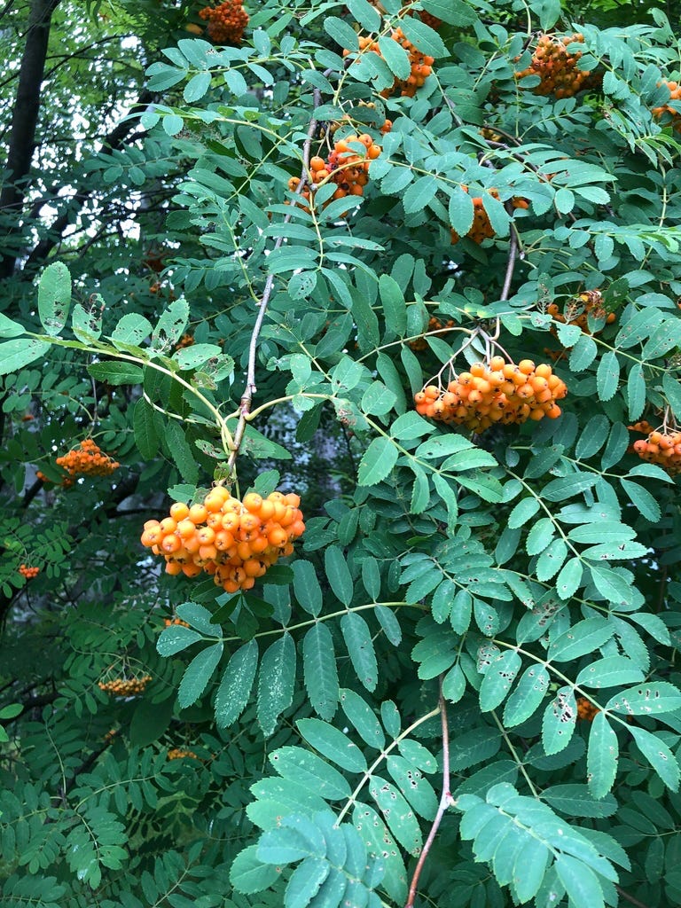 A number of Rosaceae species grow into woody shrubs and moderate sized trees. There are many species of Hawthorns (Genus Crataegus) for example and all the many species of Plums and Cherries (Genus Prunus). Then we have the Mountain Ash species of the genus Sorbus, both native and the naturalized, and often garden grown, European mountain ash (Sorbus aucuparia) which is flocked to in early winter by many fruit eating birds such as American Robins, Waxwings and European Starlings. The European mountain ash is also known as Rowan and the wood of it is said to ward off witches and makes the perfect staff for a wizard.