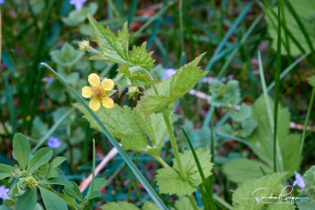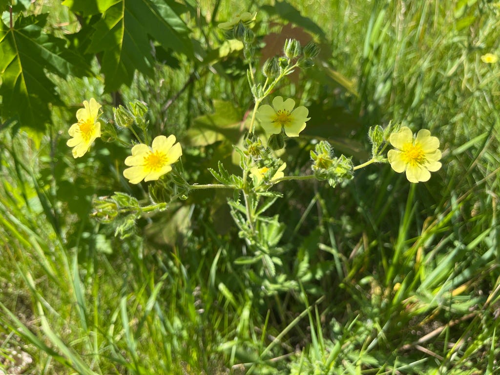 Look for the attractive Cinquefoils or Potentillas. There are many species, some native and some naturalized. They are usually low growing with yellow or white flowers showing five distinct petals (hence Cinquefoil). Local examples are Silverleaf Cinquefoil (Potentilla argentea), Rough Cinquefoil (Potentilla norvegica) and Sulphur Cinquefoil (Potentilla recta). One in particular that can be found in unmown corners of town gardens is the Mock Strawberry (Potentilla indica) which bears a large red fruit that looks remarkable like a strawberry but is quite unpalatable.