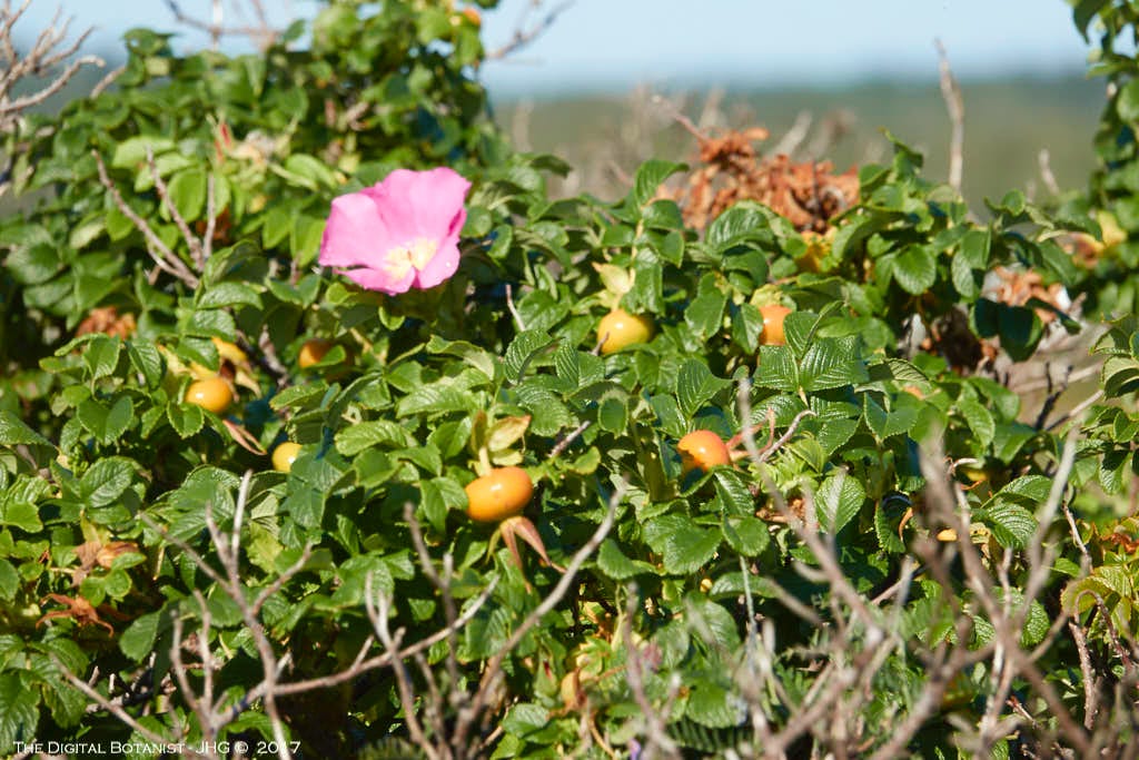 For the botanists … Roses have alternate leaves, which vary from simple to trifoliate, palmate, or pinnate. The whole leaves or smaller leaflets are frequently more or less oval-shaped with serrated edges, which is a good secondary pattern for recognizing the Rose family. As for the flowers, there are typically 5 (rarely 3 to 10) separate sepals and a similar number of petals. There are a minimum of 5 stamens, but often many more, usually in multiples of five … the result is a distinctive, fuzzy-looking center surrounded by lots of stamens. Plants of the Rose family form many different fruits, varying from fleshy fruits to various false fruits, dry seeds, capsules, or follicles.