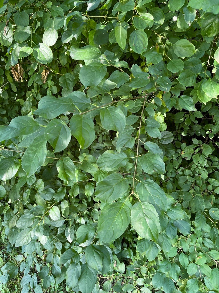 Less desirable and far too widely grown on this side the Atlantic where it neither native, nor wanted, are two species of Buckthorn. The Glossy or Alder Buckthorn (Frangula alnus) and the Common Buckthorn (Rhamnus cathartica). These spine-bearing trees are originally from Asia and Europe but far too well established here. The black berries are often only eaten by birds at the end of winter when other foods have already been consumed. The shrubs/trees form dense thickets and the roots secrete substances into the soil that inhibit other plants from growing so that the buckthorns can “take over”. Worse yet, the seeds remain viable in the soil for up to seven years meaning that this is a plant that is difficult to control - even when you think you have rooted it all out the dormant seeds pop up once your back is turned. Do not give these plants any quarter - they have to go.