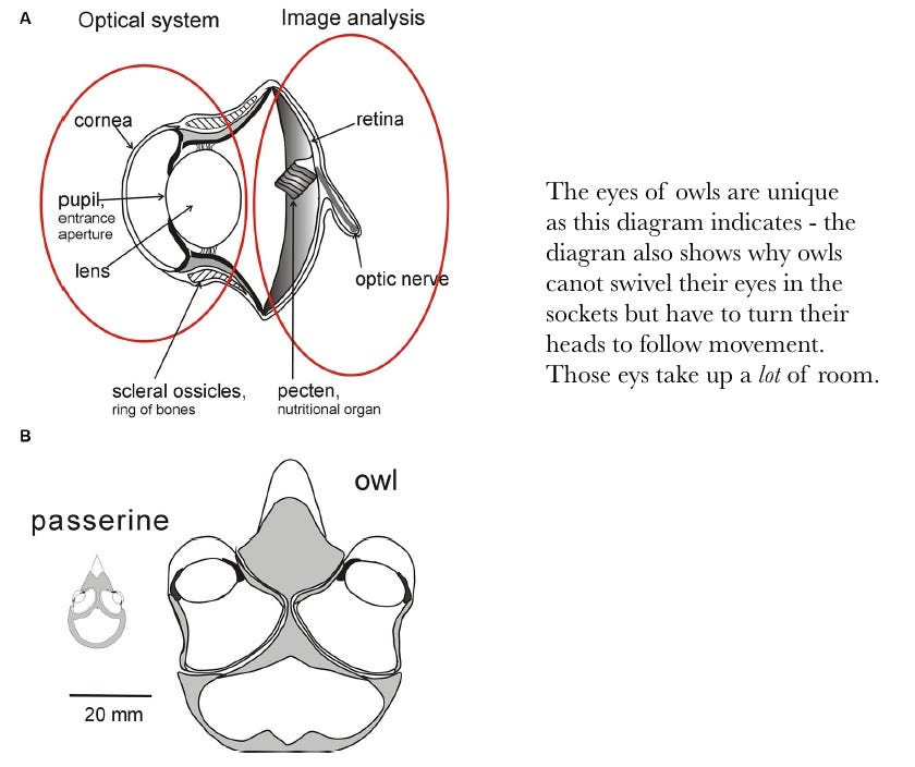Large forward‑facing eyes – providing binocular vision and depth perception The eyes are fixed in the skull, meaning that owls must swivel their heads (up to about 270°) to look around. See the diagram below.