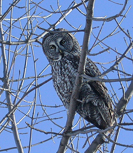 Great Gray Owls are irruptive and only seen in very occasional years, though if they visit they may stay here for an extended period allowing good opportunities for watching. One or two have been seen locally this year but “you should have been here in 2005.” That year truly was the once in a lifetime opportunity to see this species. They are the largest owl species, up to 75 cm tall with a wingspan exceeding 1.3 m. Due to specialized feather edges that muffle turbulence their flight is silent. Native to the boreal forests they are to be found on territory in old growth woodlands with good canopy, where they perch high to spot prey such as voles, mice, and shrews. Their eyes face forward, providing exceptional binocular vision and depth perception, even for owls.