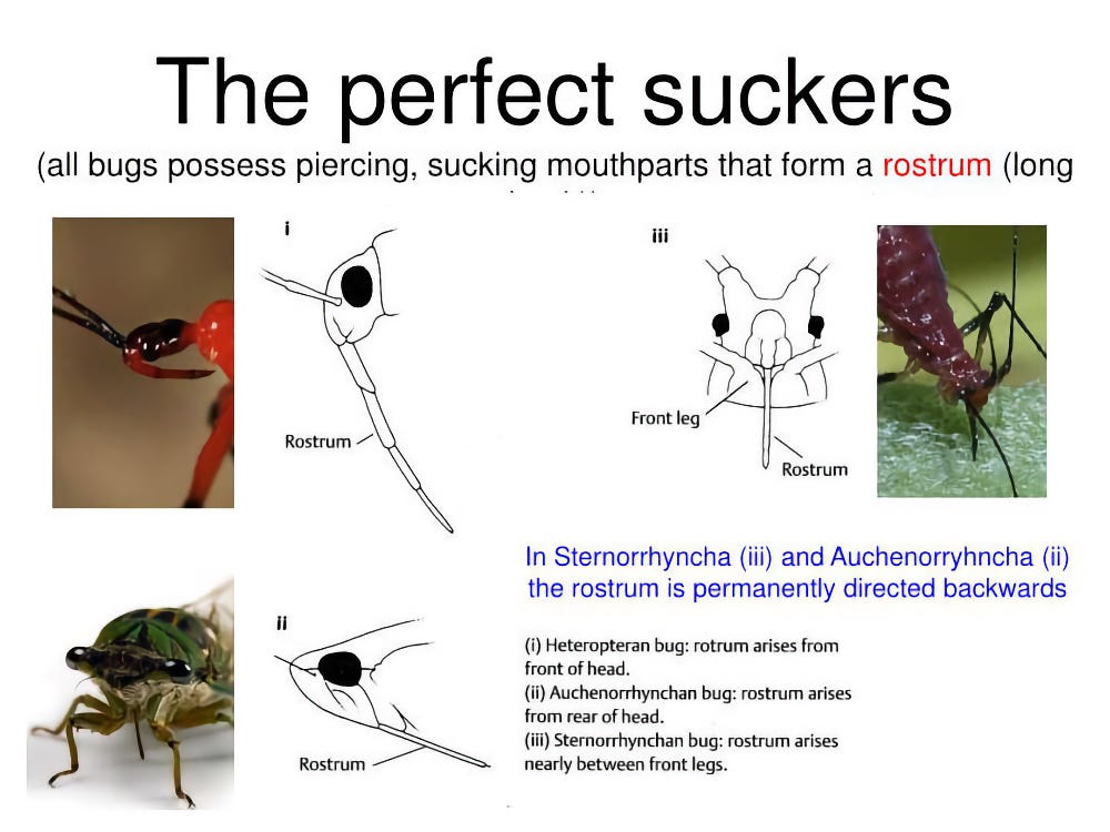 In popular culture, of course, a ‘bug’ is any sort of insect, but among entomologists, the term generally refers to the order Hemiptera, and particularly its largest subgroup Heteroptera. The word itself is a medieval English term, originally a general term for ‘something scary’ (think ‘boogeyman’ or ‘bogey’) which was first applied to insects, in reference to the bedbug, sometime in the early modern period. The defining feature of the Hemiptera is the structure of their mouthparts, which are adapted for piercing and sucking- a combined syringe and straw. Insects have two pairs of jaws, the mandibles and maxillae; in bugs, both have been elongated into hair-thin threads encased in a tubular beak. By ‘zipping’ the left and right pairs together, a tube is formed for sucking up liquid. The outer pair is needle sharp, which allows the bug to drill into plant tissue or pierce the cuticle of another insect.
