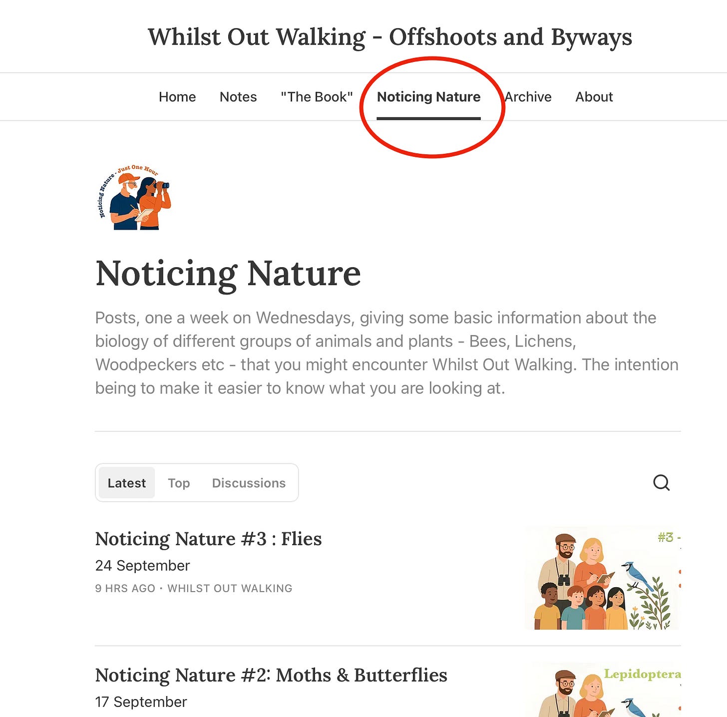 Organisational note: … these short Noticing Nature posts appear once a week and if they interest you then at some point you may want to refer back to a specific species group already dealt with. To find them, click the link in the top menu bar of any post and you will see the Noticing Nature sections in chronological order as shown below.