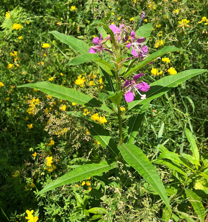 Fireweed (Chamaenerion angustifolium) is well known and hard to miss with its tall, red/pink flowers. The name comes from its ability to rapidly colonize areas burned by fire or otherwise disturbed.