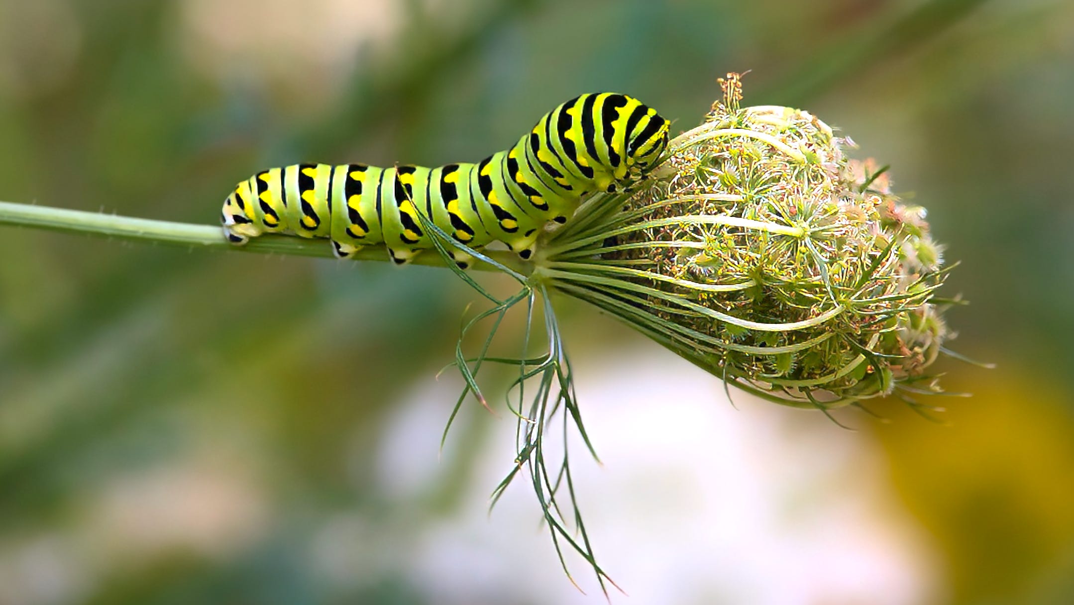 This caterpillar, here on wild carrot, absorbs substances from the host plants, making them taste poor to bird predators. The black swallowtail caterpillar has an orange "forked gland", called the osmeterium. When in danger, the osmeterium, which looks like a snake's tongue, everts and releases a foul smell to repel predators.