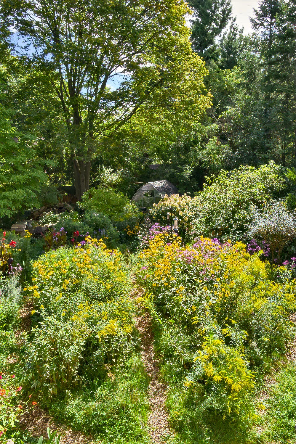 Hard to believe this is a suburban yard! Is that a functional greenhouse at the back, and is the waterfall to the left of that? Do you still feed the birds through the summer?